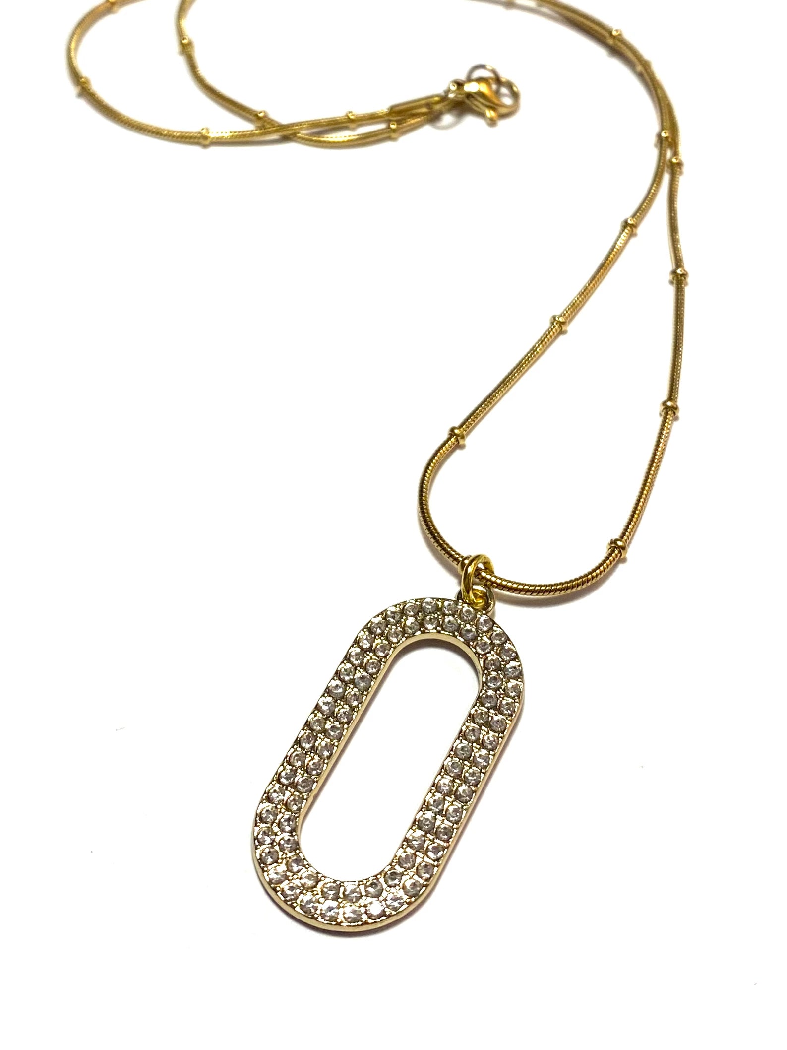 Smykke med rhinstensatt ring. Lenke av gullfarget stål.