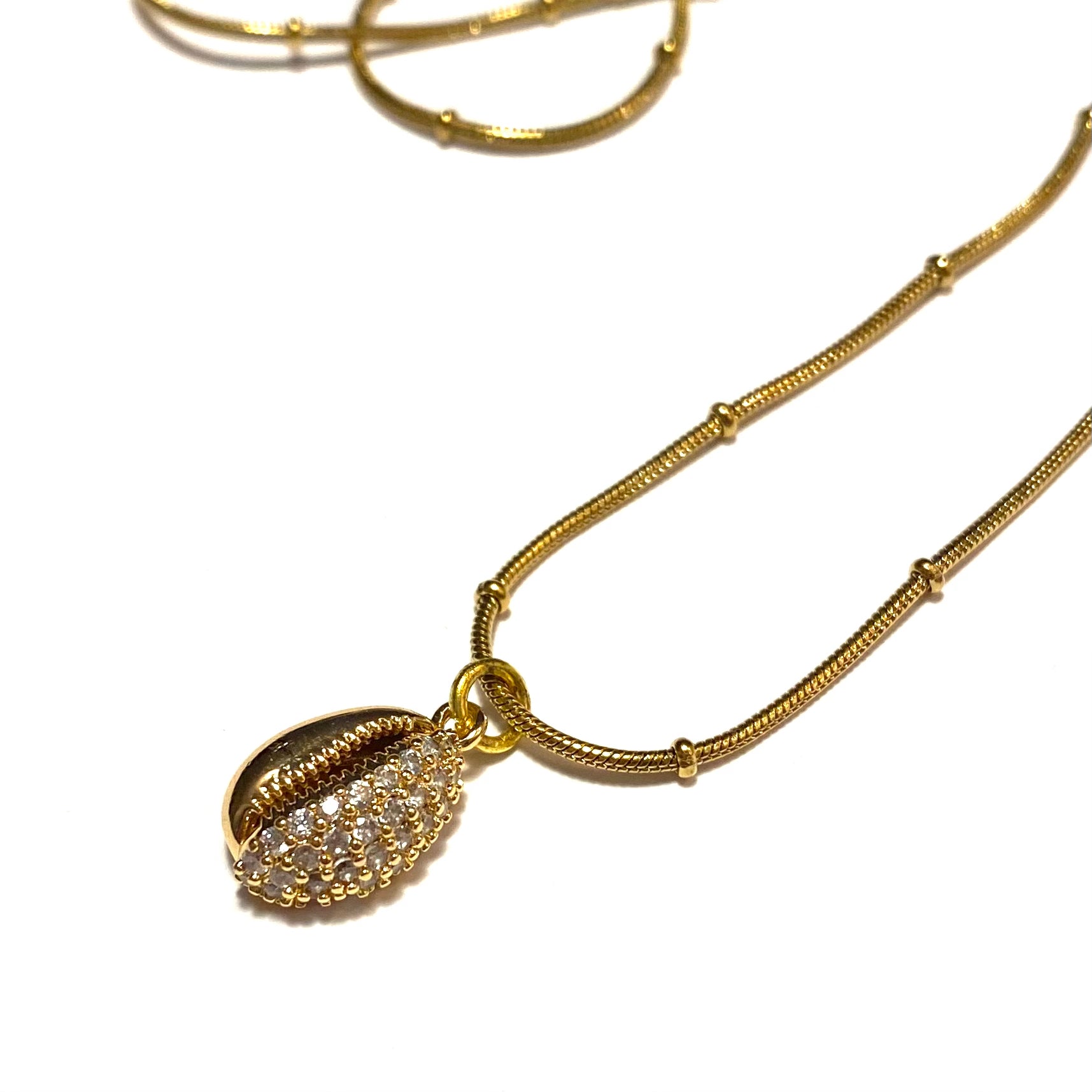 Gullfarget smykke med anheng. Lenke av gullfarget stål.