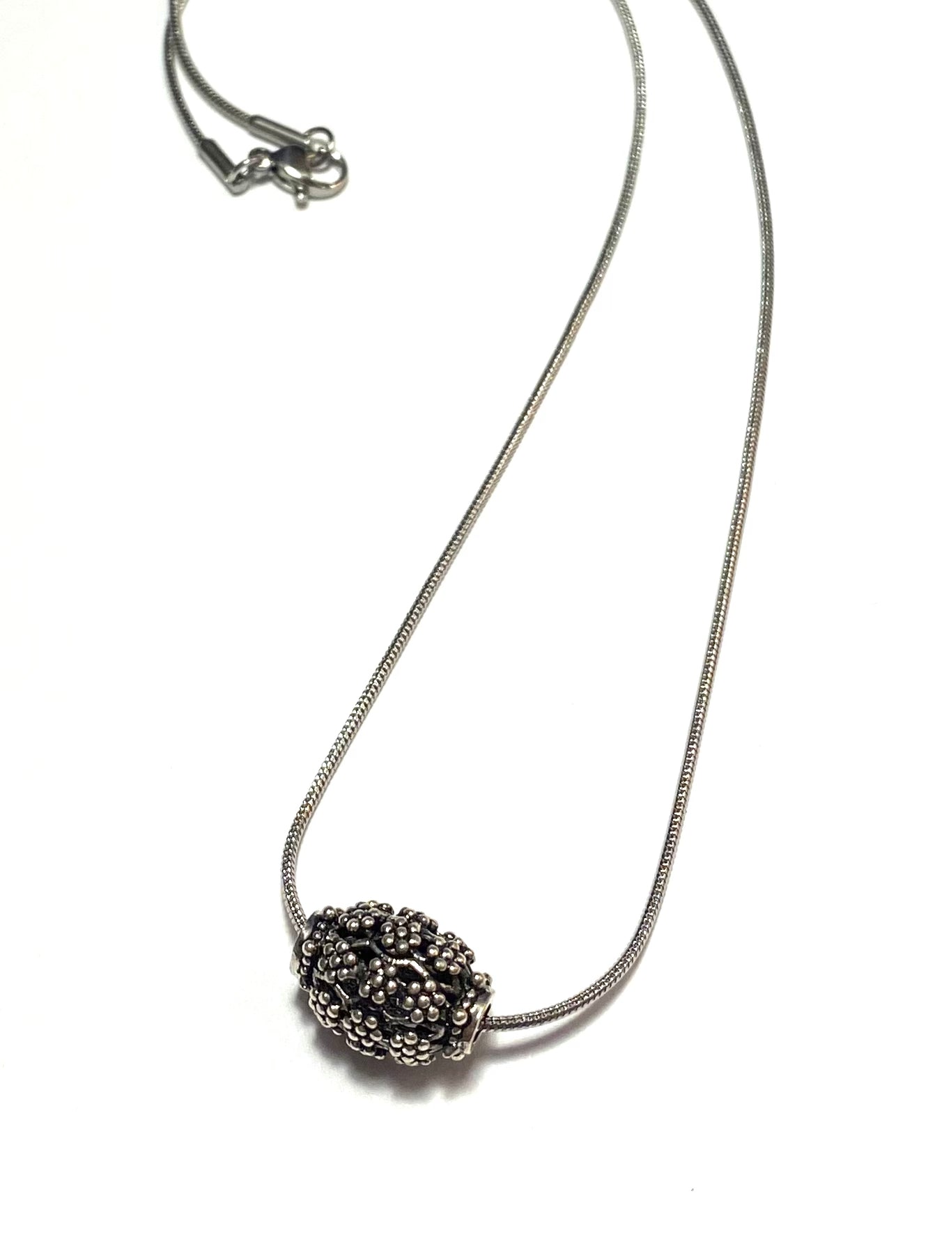 Sølvfarget smykke med blomstret kule. Lenke av stål.