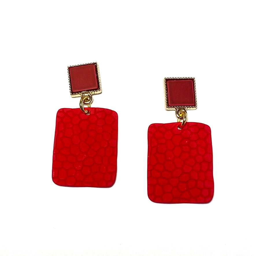 Rød ørepynt i gummibelagt metall. Gullfargede ørestikk med rødt tre.
