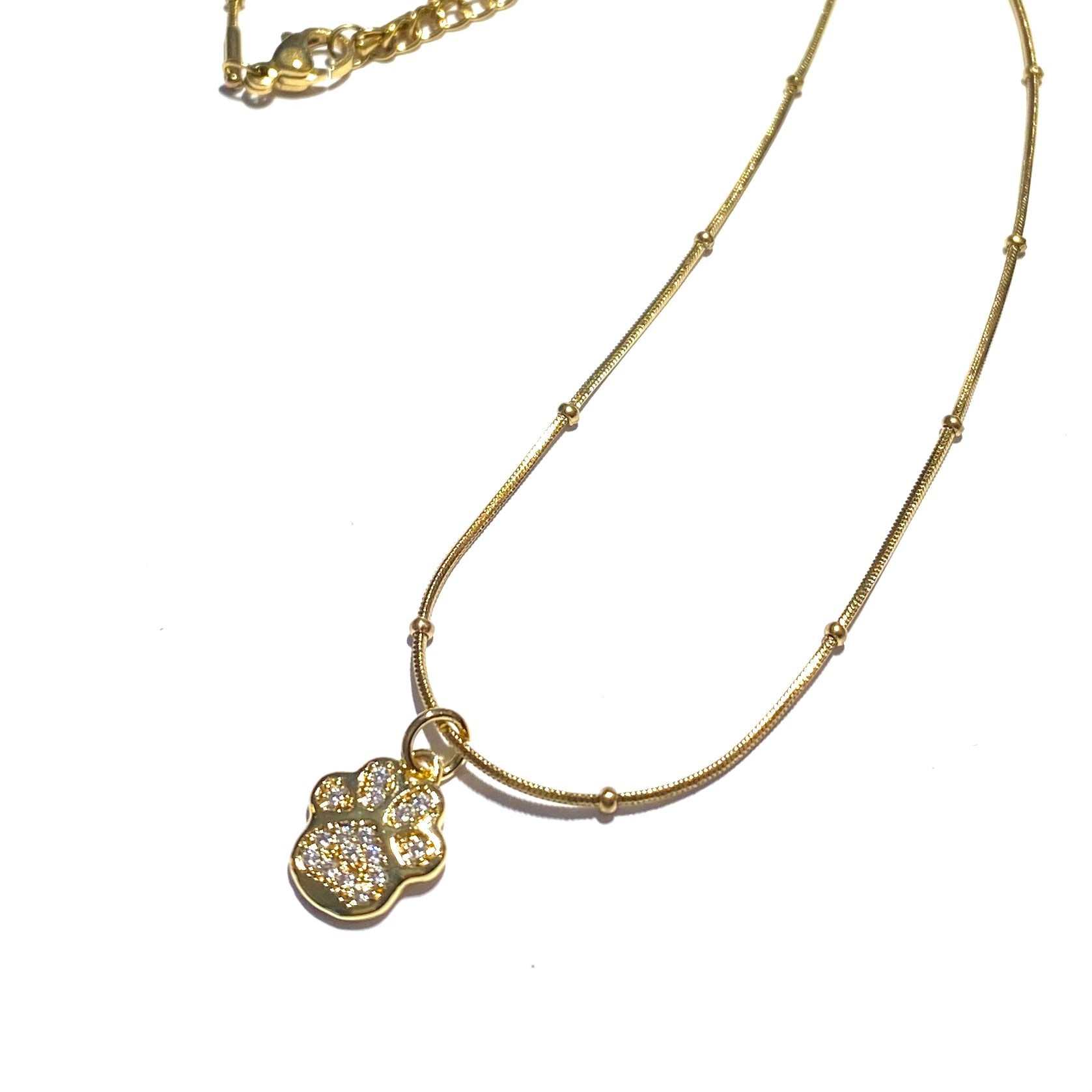 Smykke med zirconiasatt pote. Lenke av gullfarget stål.