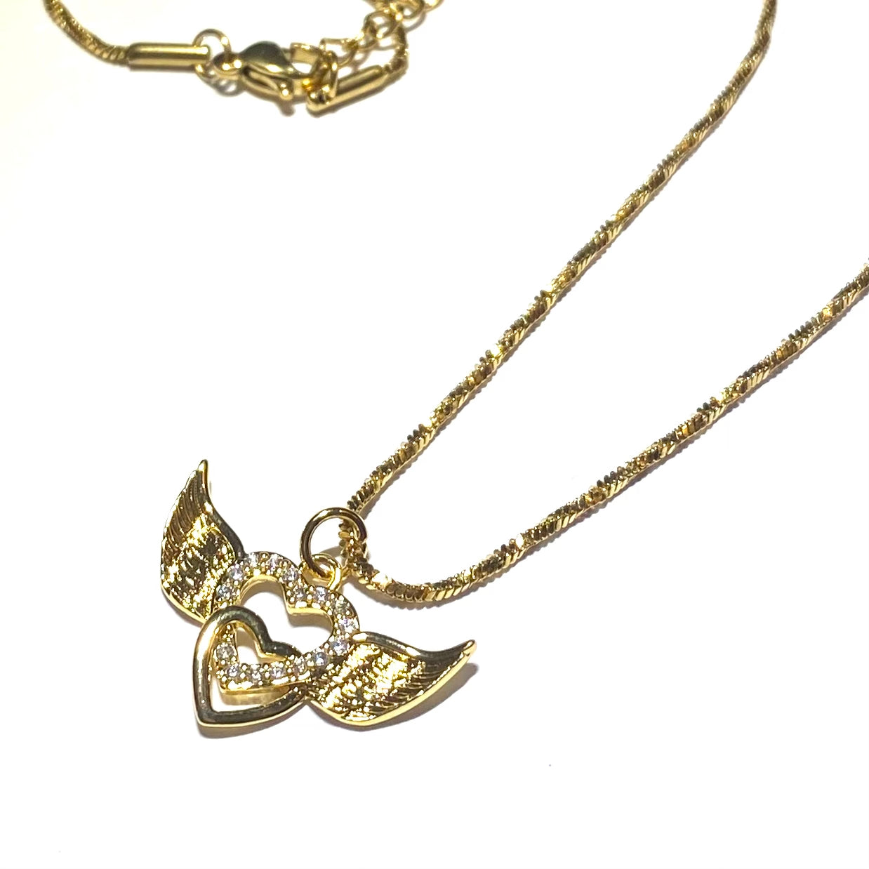 Smykke med hjerte og vinger. Lenge av 18K gullbelagt stål.