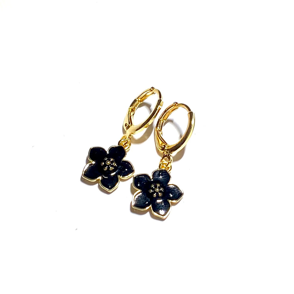 18K gullbelagte øreringer med sorte blomster.