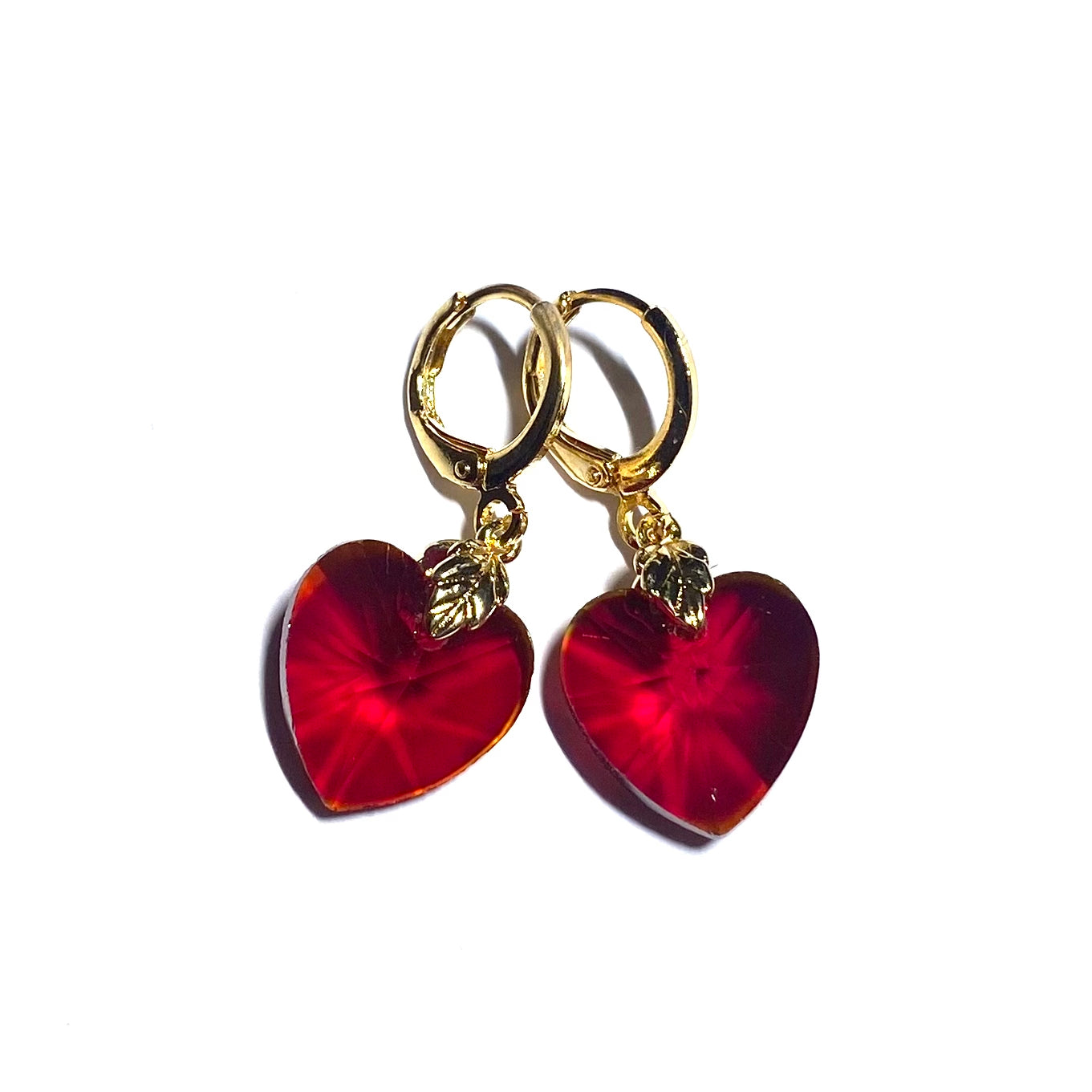 18K gullbelagte øreringer med røde fasetterte glasshjerter.