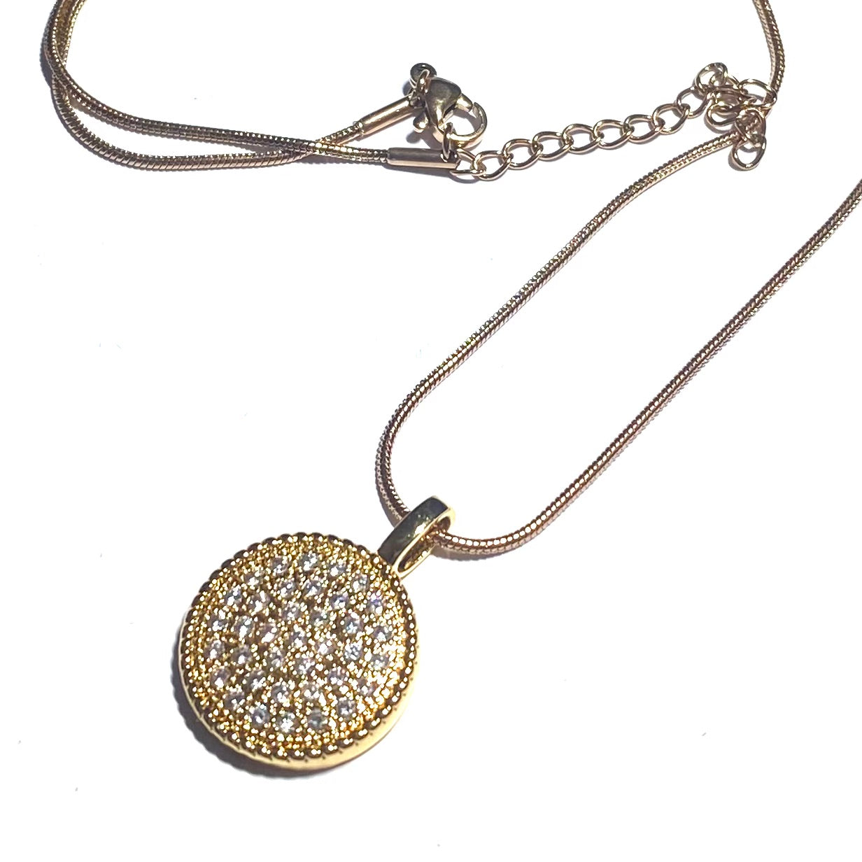 Smykke med anheng satt med rhinsten. Lenke av rosegullfarget stål.