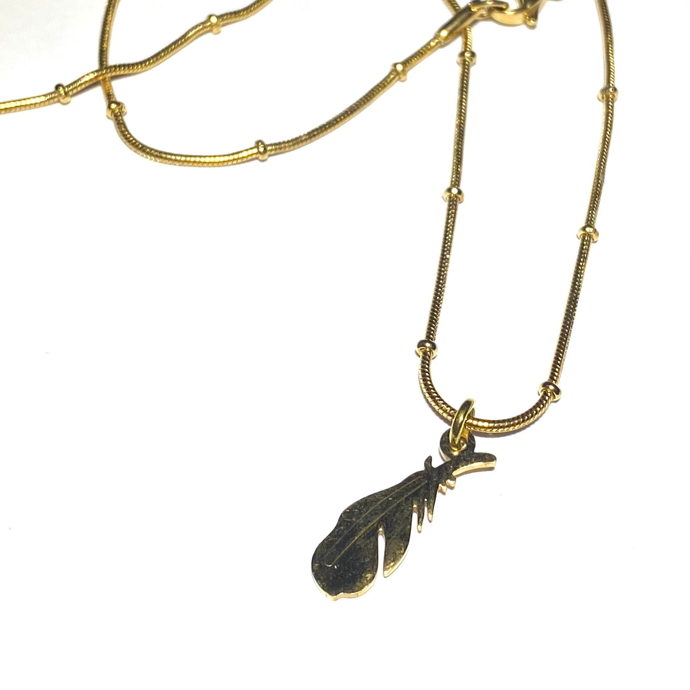 Smykke i gullfarget stål, med fjær anheng.