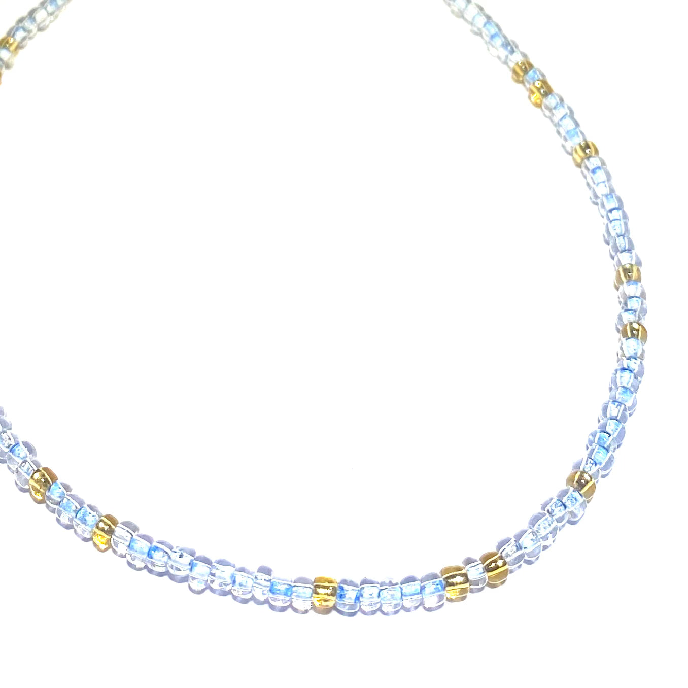 Smykke av lys blå frøperler. Gullfargede detaljer.