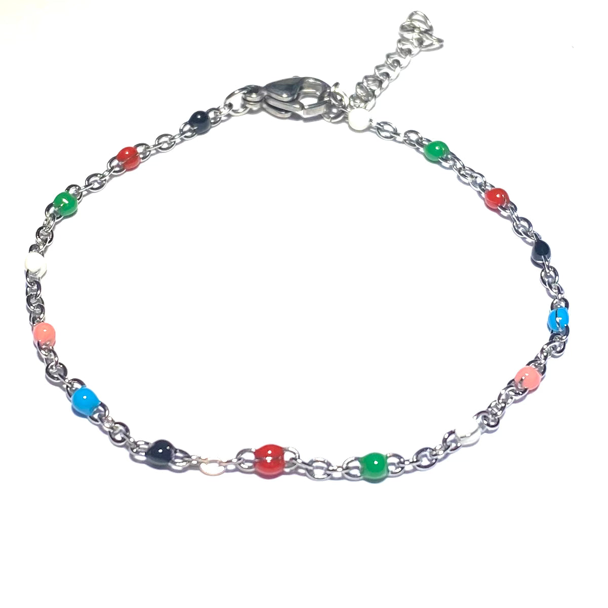 Sølvfarget armbånd i stål, med multifarget emalje.