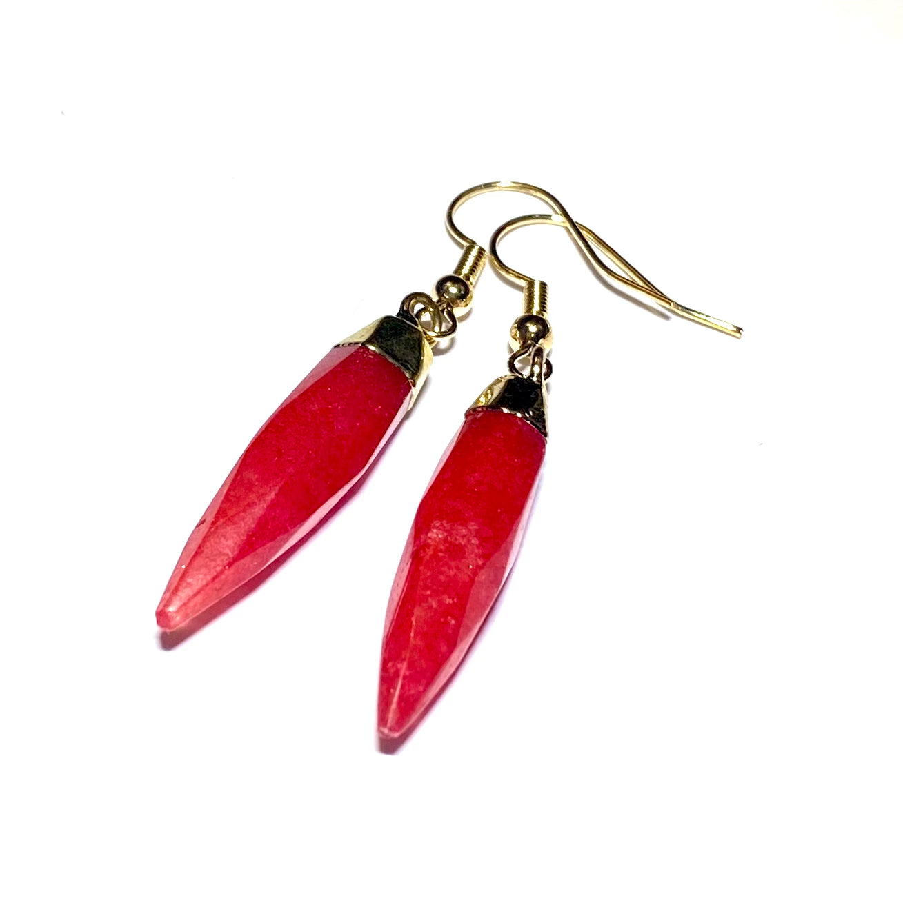 Gullfarget ørepynt med røde steiner.